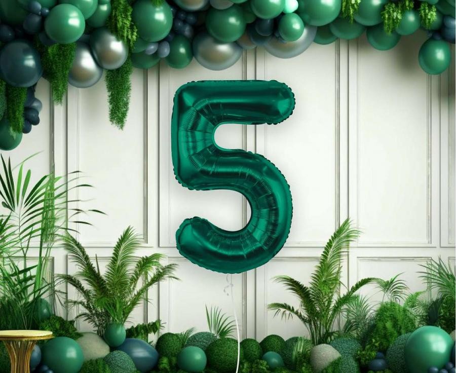 Фолиев балон цифра 5 в цвят зелен - има размер 34''/85см., в надуто състояние.